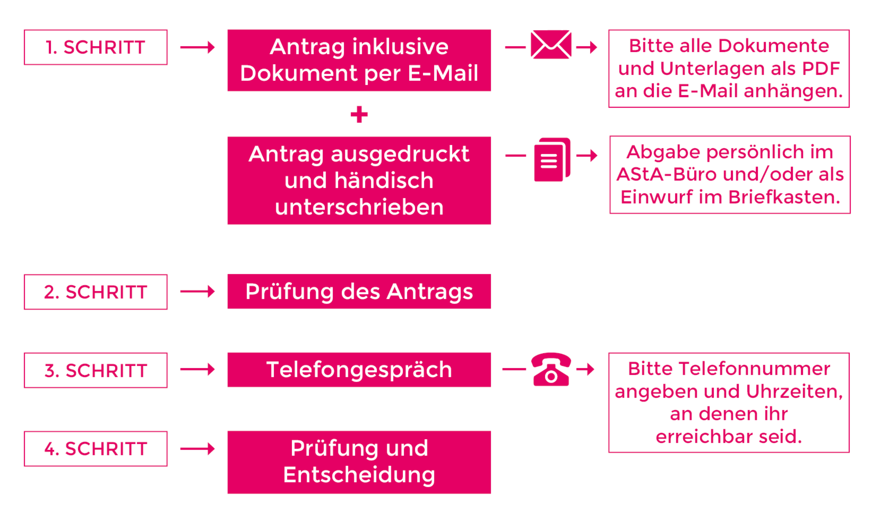 Die Bewerbung läuft auschließlich über das Online-Portal. Um dich erfolgreich zu bewerben, musst du ein Beratungsgespräch vereinbaren. Das geht unter anderem auch beim Sozial-Referat des AStA.