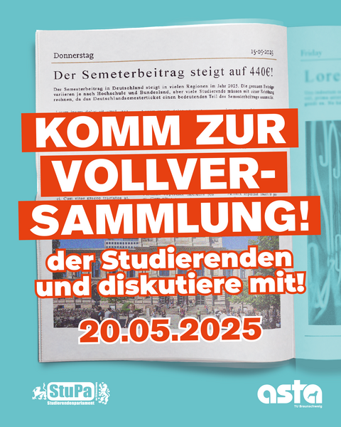 ☝ Die Sitzung wird ggf. zum ersten mal in einem Hybriden Format stattfinden, sofern technisch möglich und von der Vollversammlung verfügt. In diesem Fall könnt ihr euch unter dem folgendem Link online dazuschalten: ▶️ webconf.tu-bs.de/sve-6sr-wnu-z6w.