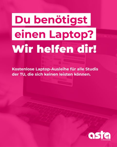 Brauchst du ein Laptop für dein Studium aber kannst dir gerade keinen leisten? Oder ist deiner genau im falschen Moment kaputt gegangen? Nicht verzagen! Bei uns kannst du dir kostenlos einen Laptop ausleihen. Schreib einfach dem Sozialreferat unter 📧 asta-sozialreferat@tu-bs.de und sende ihnen das Formular von unserer Website.