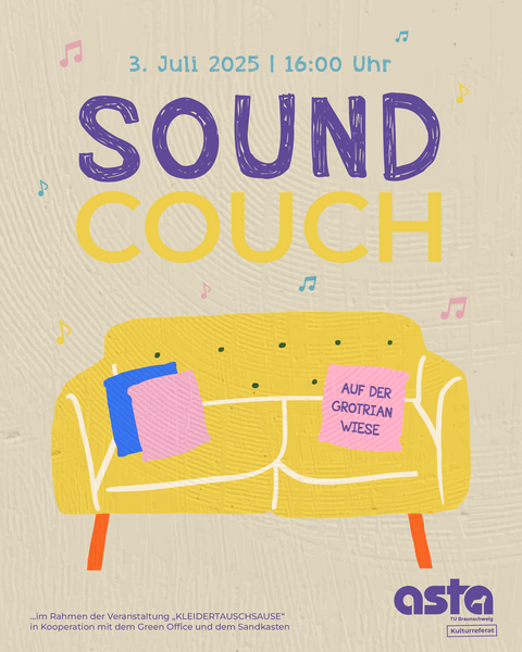 Am 03. Juli starten wir um 16:00 Uhr mit der ersten Jam Session auf der Wiese hinter dem Grotrian. Die erste Soundcouch dieses Jahr wird im Rahmen der Veranstaltung "Kleidertauschsause“ in Kooperation mit dem Green Office und dem Sandkasten stattfinden. ![]()