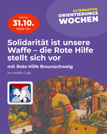 Wir sind die Ortsgruppe Braunschweig der Roten Hilfe, einer solidarischen Antirepressionsstruktur. Wir wollen euch einen Einblick in die Entstehung und Arbeit der Roten Hilfe geben, sowie uns als strömungsübergreifende Struktur vorstellen. Solidarität ist unsere Waffe!