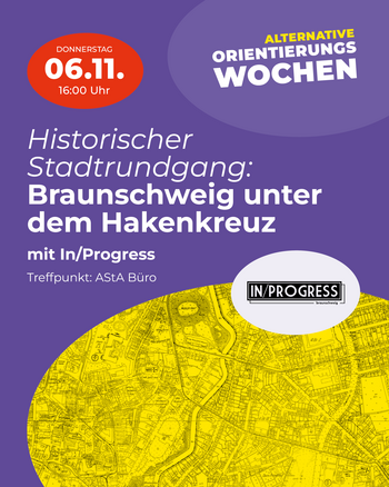 Alle antifaschistisch und historisch Interessierten lädt In/Progress um 16:00 Uhr zum Stadtrundgang "Braunschweig unterm Hakenkreuz" ein. Entlang eines 90-minütigen geführten Rundgangs durch die Stadt wird an einzelnen Stationen die Geschichte und die Auswirkungen der NS-Gewaltherrschaft aufgezeigt. Die Erzählungen an den verschiedenen Orten werden zudem durch Zeitzeugenaussagen, Tagebucheinträge und Zeitungsausschnitte veranschaulicht. Dabei wird der Rundgang vordergründig die Vorstellung der Nazis von Erziehung, Bildung und Kultur in der Gesellschaft thematisieren und über Braunschweig zur Zeit des Nationalsozialismus berichten. Die Durchsetzung nationalsozialistischer Prinzipien ging nicht nur allgemein auf Kosten emanzipatorischer Vorstellungen von Wissenschaft sondern auch ganz konkret zu Lasten zahlreicher Lehrender, Wissenschaftler:innen und Kulturschaffender. Neben Kommunist:innen, Sozialdemokrat:innen und Liberalen traf die staatliche Gewalt in allen Bereichen jedoch vor allem Sinti:zze sowie jüdische Menschen.
