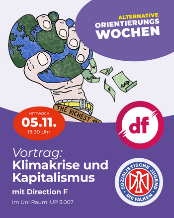 Das Thema Klima ist seit dieser Woche für viele Aktivist:innen keins mehr. Aufrüstung, Krieg, Sozialkürzungen und immer weiter erstarkende rechte Strukturen bestimmen vielerorts die Diskurse. In diesem Vortrag wollen wir einen Blick darauf werfen, warum die Klimakrise und eine kapitalismuskritische Analyse davon weiterhin relevant und wichtig sind - vielleicht mehr denn je!