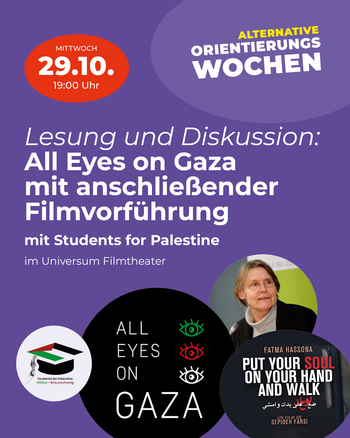 Euch erwartet eine Lesung und Diskussion mit Helga Baumgarten ("Völkermord in Gaza") und eine Filmvorführung von "Put Your Soul On Your Hand And Walk" (2025) von Sepideh Farsi über die Zeugenschaft der Journalistin Fatma Hassona.