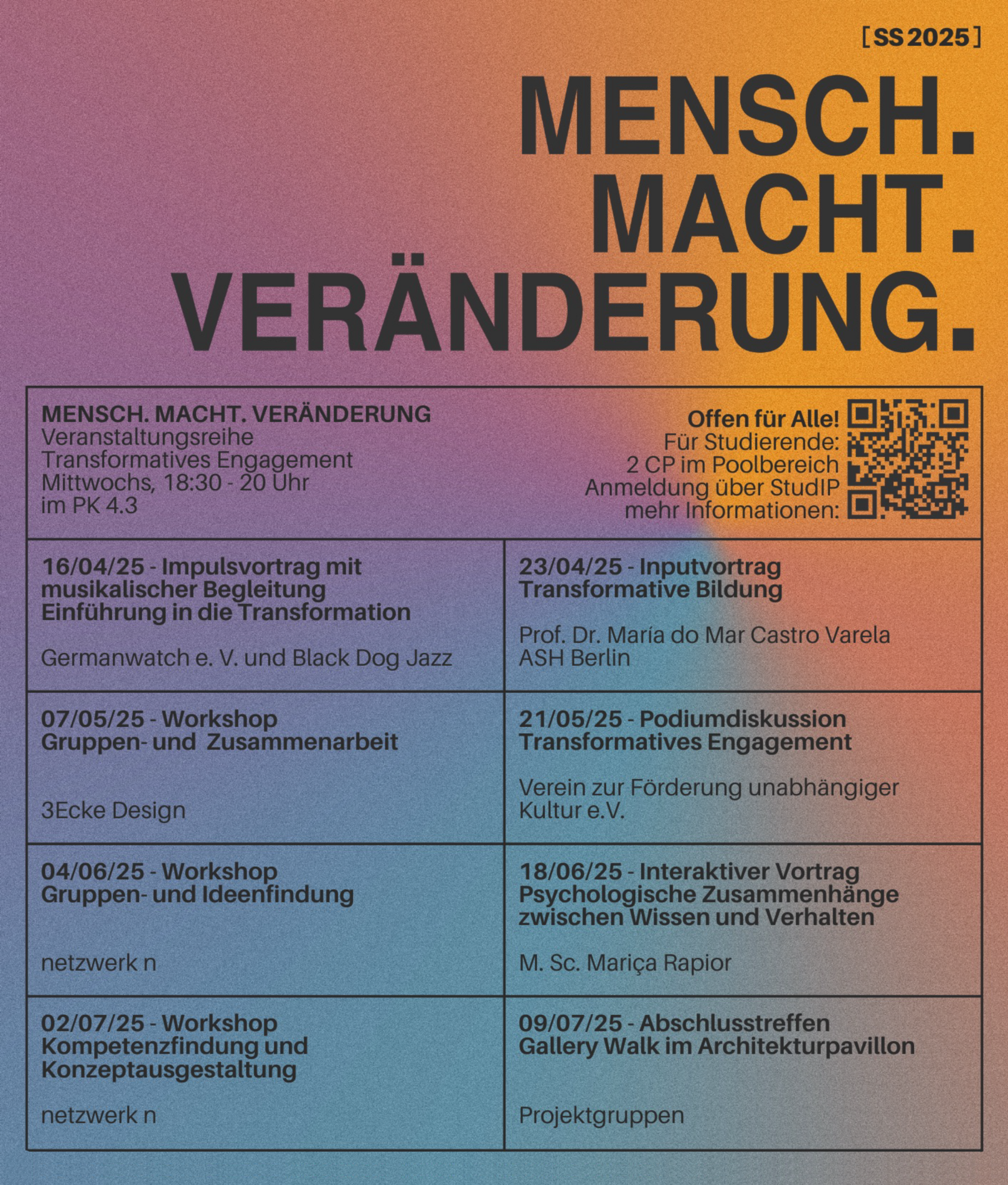 Im Sommersemester 2023 haben wir uns im Rahmen der Vorlesungsreihe „System. Macht. Ungerechtigkeit.“ inhaltlich mit verschiedenen Formen der Diskriminierung auseinandergesetzt. Nun gehen wir einen Schritt weiter und legen den Fokus auf die aktive Mitgestaltung unseres Umfelds. In „Mensch.Macht.Veränderung.“ setzten wir uns unabhängig von unserem Vorwissen damit auseinander, wie wir uns nachhaltig und antidiskriminierend in unserem Wirkungsfeld einbringen können.